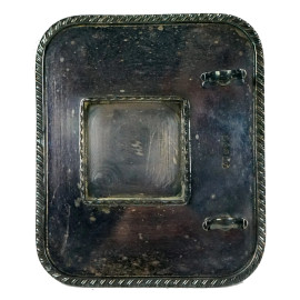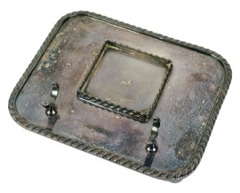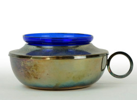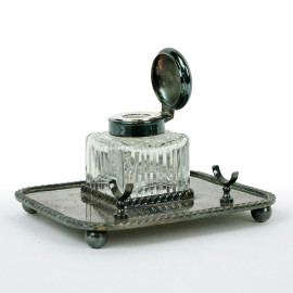 Lotto composto da un calamaio ed un portacandela in metallo argentato, ampolla e vaschetta in vetro, XX secolo, misure max cm8x13x11, (mancanze)