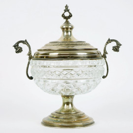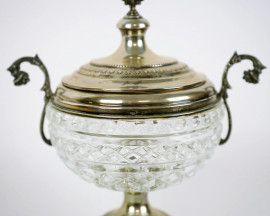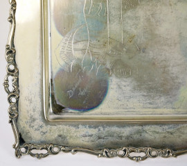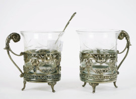 Lotto composto da una zuccheriera, due salierine con cucchiaini, un vassoio, due bicchierini in vetro, argento e metallo argentato, misure max cm 29x16.