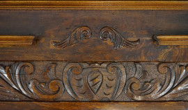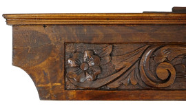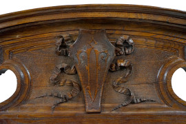 Lotto di due grandi fregi in noce, centrati da motivi scolpiti a foggia di scudetti e motivi floreali, misure max cm 37x160x12, inizi XX secolo, (difetti).