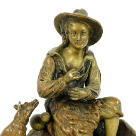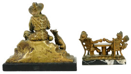 Lotto di due gruppi di sculture in antimonio raffiguranti bevitori al tavolo e un pastorello con cane, misure max cm 15x17,5x7, XX secolo, (mancanze)