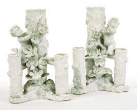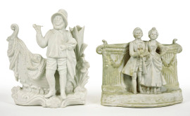 Lotto di quattro oggetti in biscuit raffiguranti coppia di gentiluomini, marinaio e cherubini, alt. max cm 15, XX secolo, (difetti).