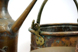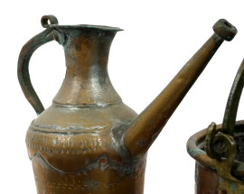 Lotto di sette oggetti in rame e metallo, alt. max cm 31,5, XX secolo, (difetti e mancanze).