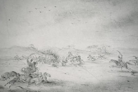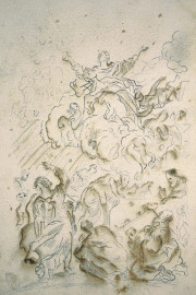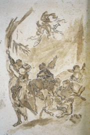 Lotto di tre bozzetti raffiguranti il Ritrovamento di Romolo e Remo, Assunzione della Vergine e scena di battaglia, inchiostro, matita e acquarello su carta, misure max cm 31x21,5, XIX secolo, (difetti).