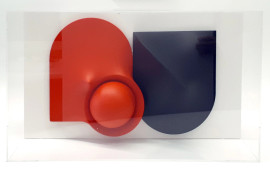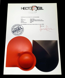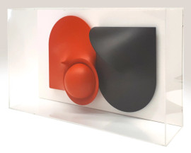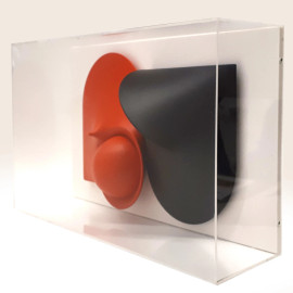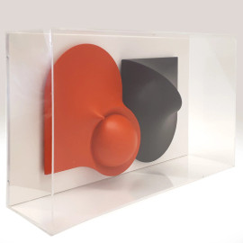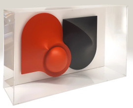Maestro dello Spazialismo del XX sec., Doppia superficie rosso/nero, 2016, vernice acro vinilica su tela estroflessa, cm 42x32, firma anno e timbro dell’Artista al retro con autentica, l’opera è conservata in elegante teca in plexiglass e corredata di autentica dell’Artista
