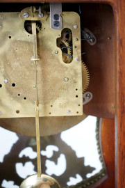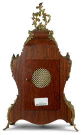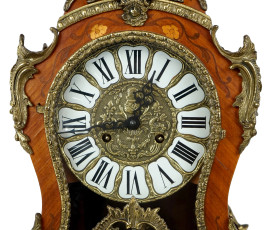 Orologio stile Luigi XV, cassa impiallacciata ed intarsiata in varie essenze, quadrante e finiture in bronzo dorato, cm h 58x31x14, (meccanismo da revisionare).