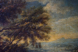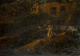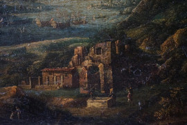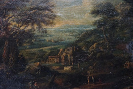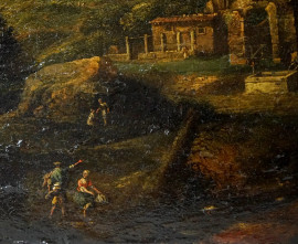 Paesaggio con figure, olio su tavola, cm 33x43,5, XVIII secolo, (lievi difetti).