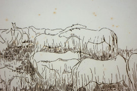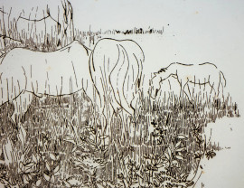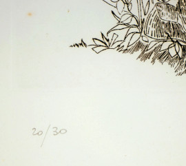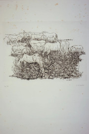 Paesaggio con mucche, litografia, cm 57x48, firmato E.Di Marco, ES.20/30, entro cornice.
