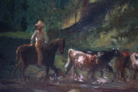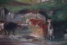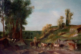 Paesaggio con pastore ed armenti, olio su tela, cm 67x92,5, XX secolo, entro cornice.
