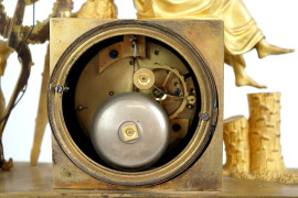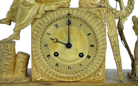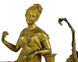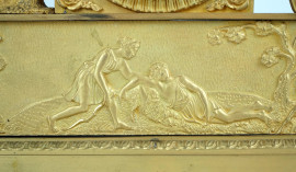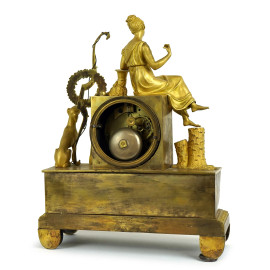 Pendola da tavolo in bronzo dorato sormontata da Diana cacciatrice, quadrante in bronzo a numeri romani finemente cesellato, fascia decorata a bassorilievo, Francia, XIX secolo, cm h 35,5x28,5x10, (meccanismo da revisionare).