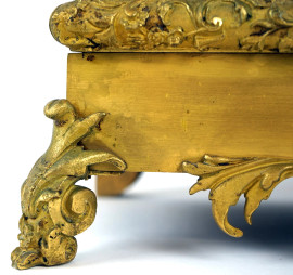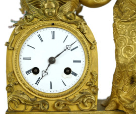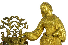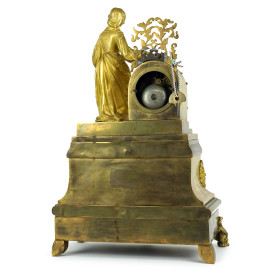 Pendola da tavolo in bronzo dorato sormontata da figura femminile, quadrante smaltato a numeri romani, fascia finemente decorata, Francia, XIX secolo, cm h 50x34x15, (difetti al quadrante, meccanismo da revisionare).