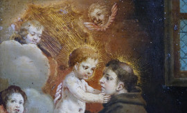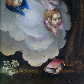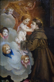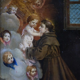 Pittore del XVIII secolo, Sant'Antonio da Padova con il Bambinello e cherubini, olio su rame, cm 21,5x16, entro cornice.