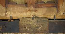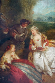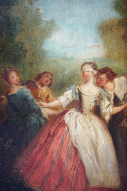 Pittore francese del XIX secolo, coppia di dipinti raffiguranti la mosca cieca e la lezione di musica, olio su tela, cm 47x30,5, entro cornici