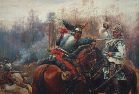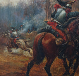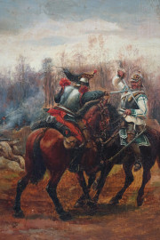 Pittore francese del XIX secolo, Scontro tra cavalieri, olio su tavola, cm 23,5x18, entro cornice