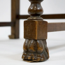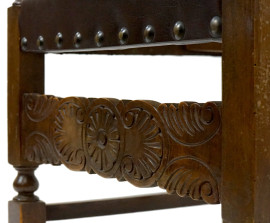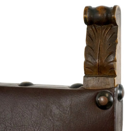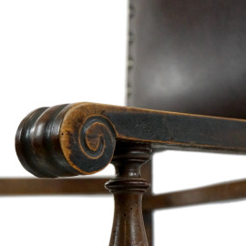Poltrona neorinascimentale in noce, seduta e schienale rivestiti in cuoio, braccioli a ricciolo, piedi anteriori leonini, cm h 114, (difetti).