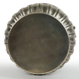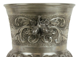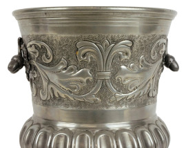 Porta champagne in peltro, corpo baccellato, fascia superiore con decori incisi e sbalzati, prese a forma di ghiande, cm h 20,5, XX secolo, (segni del tempo).
