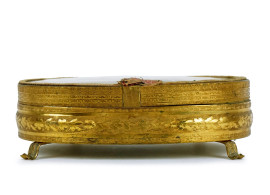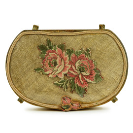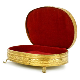 Portagioie in tessuto ricamato e metallo dorato, interno rivestito in velluto bordeaux, cm h 6x20x13, XX secolo, (segni del tempo).