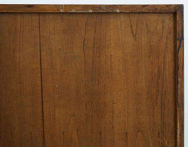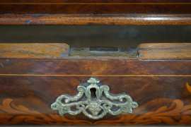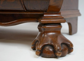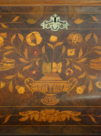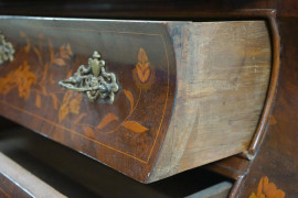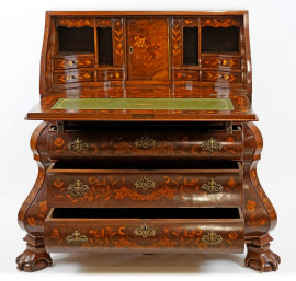 Ribalta olandese, impiallacciata ed interamente intarsiata a intrecci floreali. La parte superiore con calatoia formante scrittoio con all'interno cassettini e sportellino centrale, la parte inferiore con tre tiretti e zampe rapaci, cm 109x100x60, (piccoli difetti)