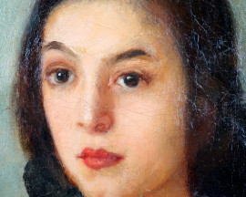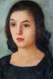 Ritratto di donna, olio su tela riportata su cartone, cm 39x34, firmato Guidi, entro cornice.