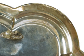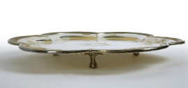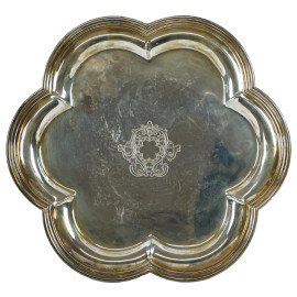Salver in argento 925 Ventrella, di linea polilobata con decoro inciso, cm 2,5x23, peso gr. 390.
