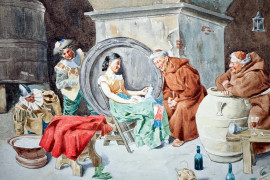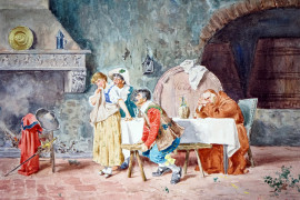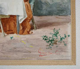 Scene di interno, due acquarelli su carta, cm 18,5x26,5 circa, XIX-XX secolo, entro cornici.