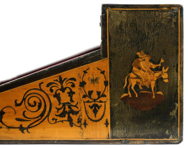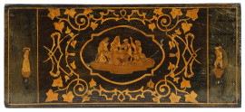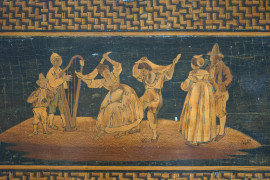 finemente intarsiato in varie essenze pregiate, decorazione a micromosaici geometrici che racchiudono una grande tarsia centrale raffigurante la Tarantella, retro e laterali decorati da scene di vita quotidiana, cm 14x33x28, (normali segni del tempo)