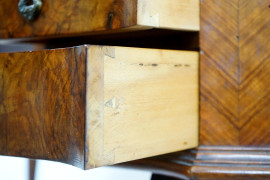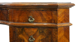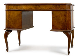 Scrivania da centro in noce e radica di noce, XX secolo, piano sagomato, fronte a nove cassetti, gambe mosse, cm h 76,5x110x65