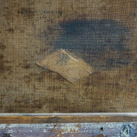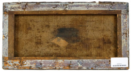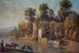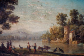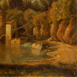 Scuola italiana del XIX secolo, paesaggio con danzatori, olio su tela, cm 22,2x42,3, firmato in basso a destra