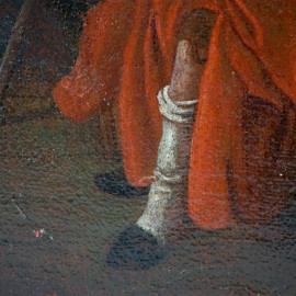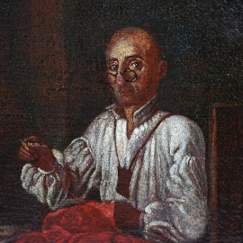 Scuola lombarda del XVII secolo, Scena di interno con sarto, olio su tela, cm 36,5x29x3