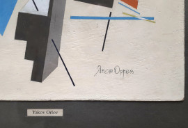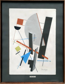 Scuola russa del 900, Composizione suprematista, tempera su carta, cm 45x31, firmato in caratteri cirillici, entro cornice.