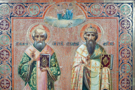 Scuola russa, fine XIX secolo, Icona raffigurante San Giuliano e San Cirillo, tempera su tavola, cm 27x22,5, (piccole cadute di colore)