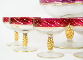 Servizio da macedonia in vetro, composto da un centrotavola e sei coppette, fascia rossa e fusto dorato, alt. max cm 16,5, XX secolo, (lievi difetti).