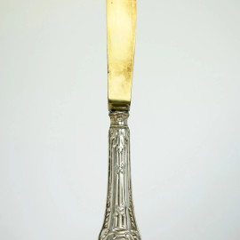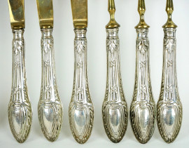 Servizio di posate da dolce, composto da una paletta, sei forchettine e sei coltellini in metallo dorato e manici in argento, XX secolo.