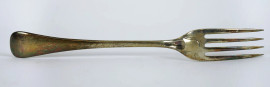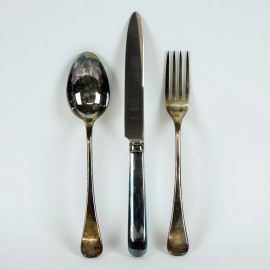 Set di tre posate in argento, composto da una forchetta, un cucchiaio ed un coltello, gr.100, (segni del tempo).