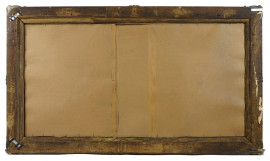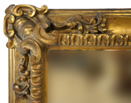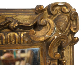 Specchiera di linea rettangolare in legno intagliato e dorato, inizi XX secolo, cm h 197x115, (difetti).