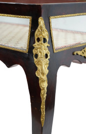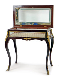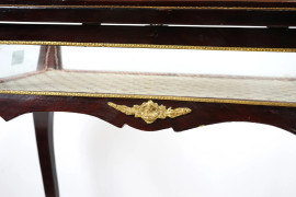 Tavolo bacheca stile Napoleone III in mogano, gambe mosse, finiture in metallo dorato, cm 81x74,5x39,5