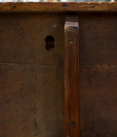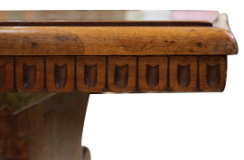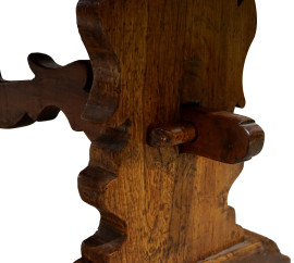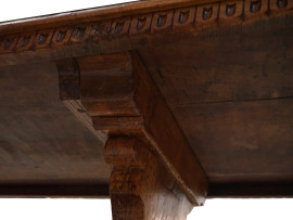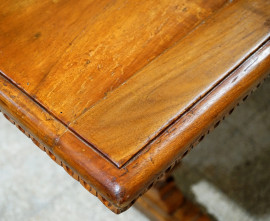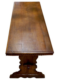 Tavolo fratino in noce, XVIII secolo, piano di linea rettangolare con fascia dentellata, poggiante su due montanti laterali ad asso di coppe riuniti da traversa, cm h 84x260x72, (difetti).