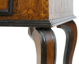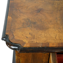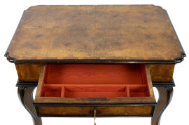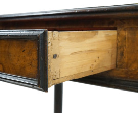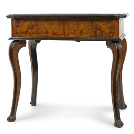 Tavolo scrittoio in radica, XIX secolo, piano di linea rettangolare, un cassetto nella fascia, poggiante su quattro gambe mosse, cm h 78x80x56, (lievi difetti).