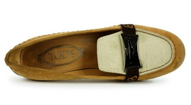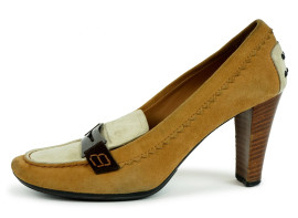 Tod's, paio di scarpe con tacco in camoscio beige e bianche, numero 37 1/2, (segni di utilizzo).