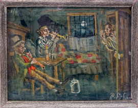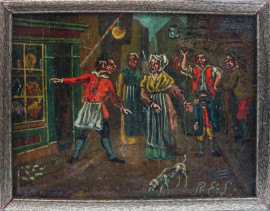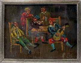 Tre miniature raffiguranti scene di genere, olio su tavola, siglate in basso a destra, entro un'unica cornice, ingombro totale cm 21x53,5