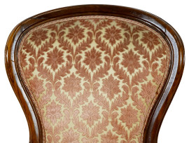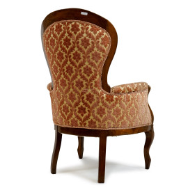 Tre poltrone in noce, XX secolo, imbottite e rivestite in tappezzeria damascata, gambe mosse, cm h 101, (difetti).