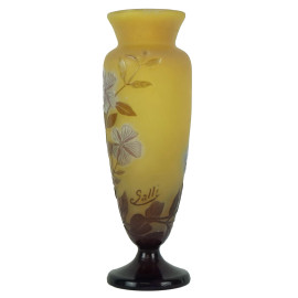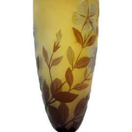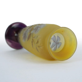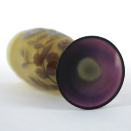 Vaso in vetro satinato con decori fogliacei bordeaux, cm h 21, firmato Gallé, (segni del tempo).