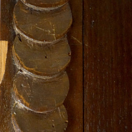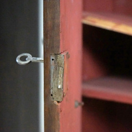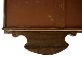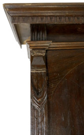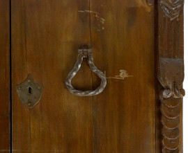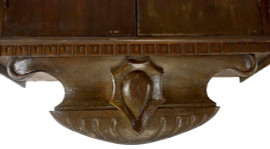 Coppia di armadietti pensili in noce, inizi XX secolo, cappello aggettante modanato e dentellato, fronte a due ante, fregio scolpito con scudetto, cm h 127x100x43, (difetti)