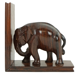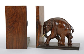 Coppia di fermalibri in legno a forma di elefanti, cm h17x16,5x8, XX secolo, (segni del tempo e mancanze).