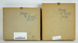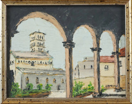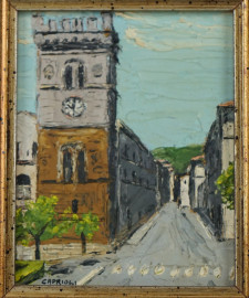 Coppia di miniature raffiguranti scorci di paese, olio su tavola, cm 9x7, firmate, entro cornici