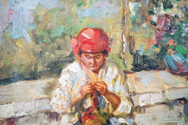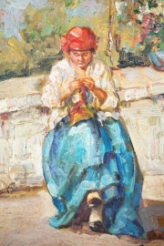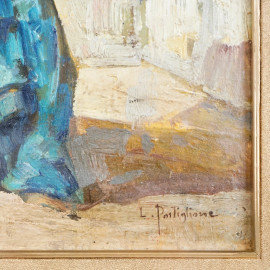 Donna che cuce, olio su compensato, cm 30x23, firmato L.Postiglione, entro cornice.