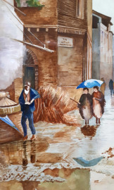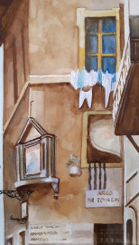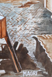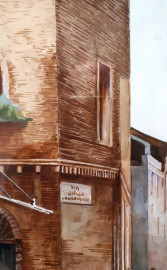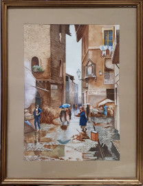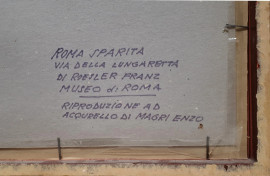 Enzo Magri seguace di Ettore Roesler Franz, Roma sparita - via della Longaretta, acquarello su carta, cm 44x32, firmato