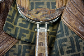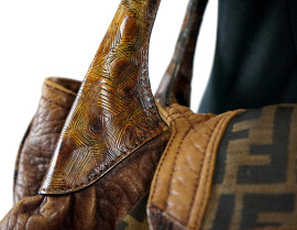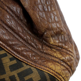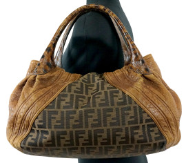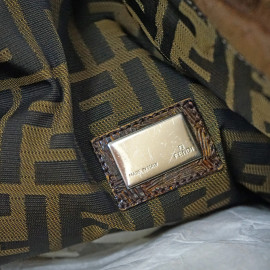 Fendi, borsa modello Spy, tela con monogram beige e nero, finiture e manici in pelle, cm 34x44x23, (segni di utilizzo).