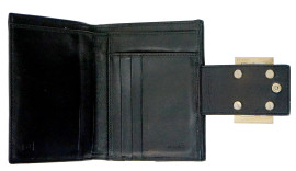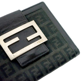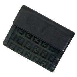 Fendi, portafoglio in tela nera con monogram ed inserti in pelle, cm 13x10, n. di serie 249797, (segni di utilizzo).