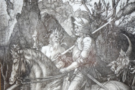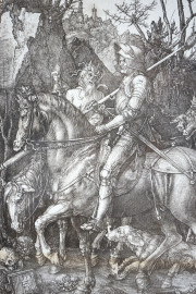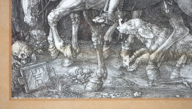 Il cavaliere, la morte e il diavolo, stampa riproduzione da Albrecht Dürer (1471-1528), cm 24x18, XX secolo, entro cornice, (macchie)