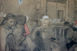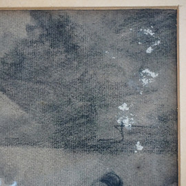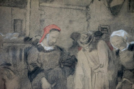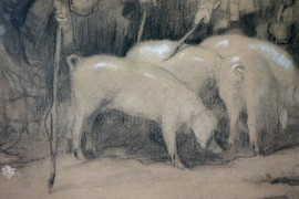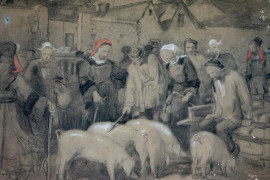 Il mercato di maiali, tecnica mista su carta, cm 35x46,5, firmato, entro cornice.